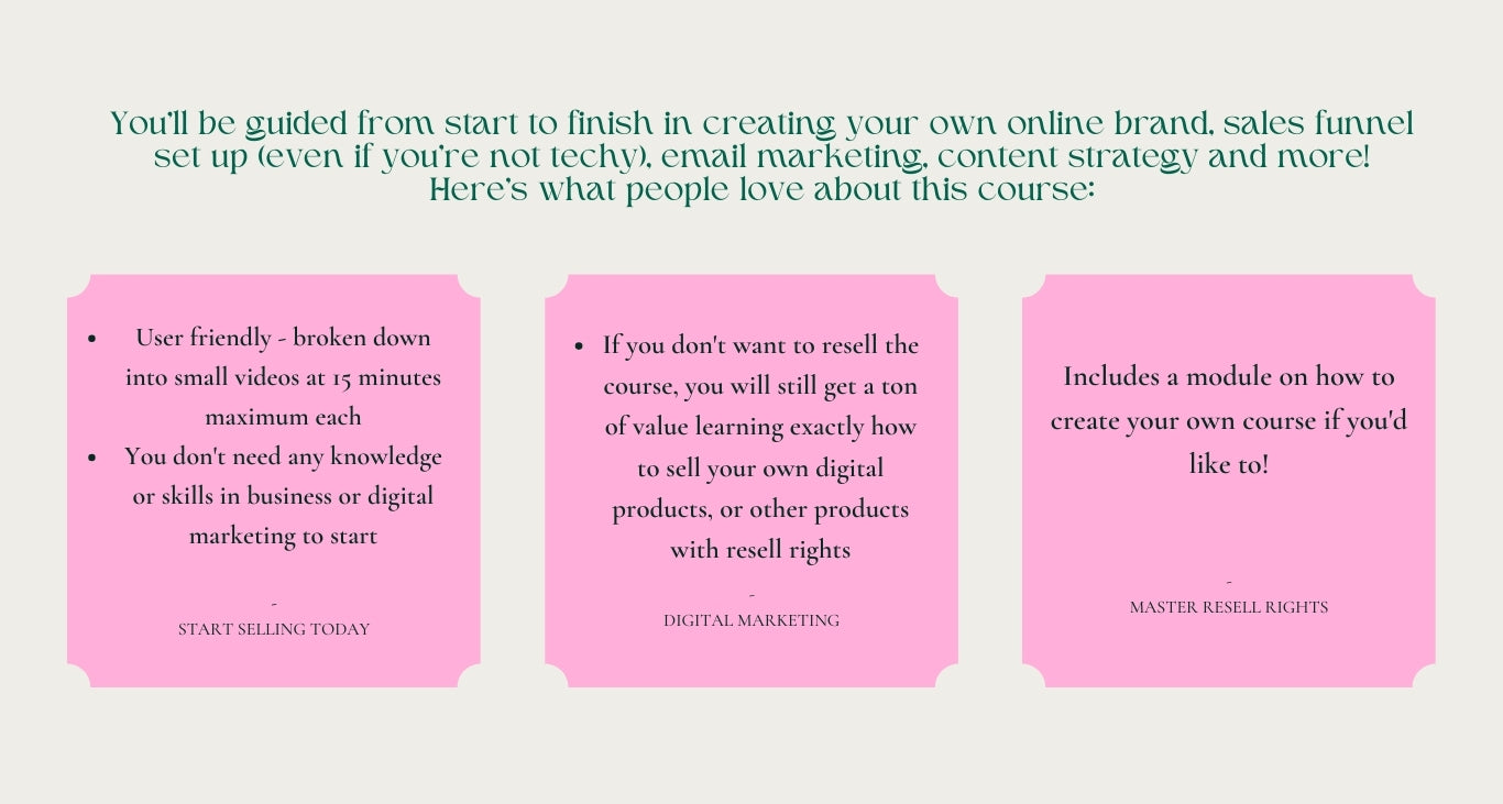 A: Encompassing 11 comprehensive and self-paced modules, this course is equipped with video tutorials and essential tools meticulously designed to lead rookies through every step of the journey. From launching your very own online business to mastering the art of reselling digital products, this course is your roadmap to success. Keep scrolling to delve into the details of each module.
